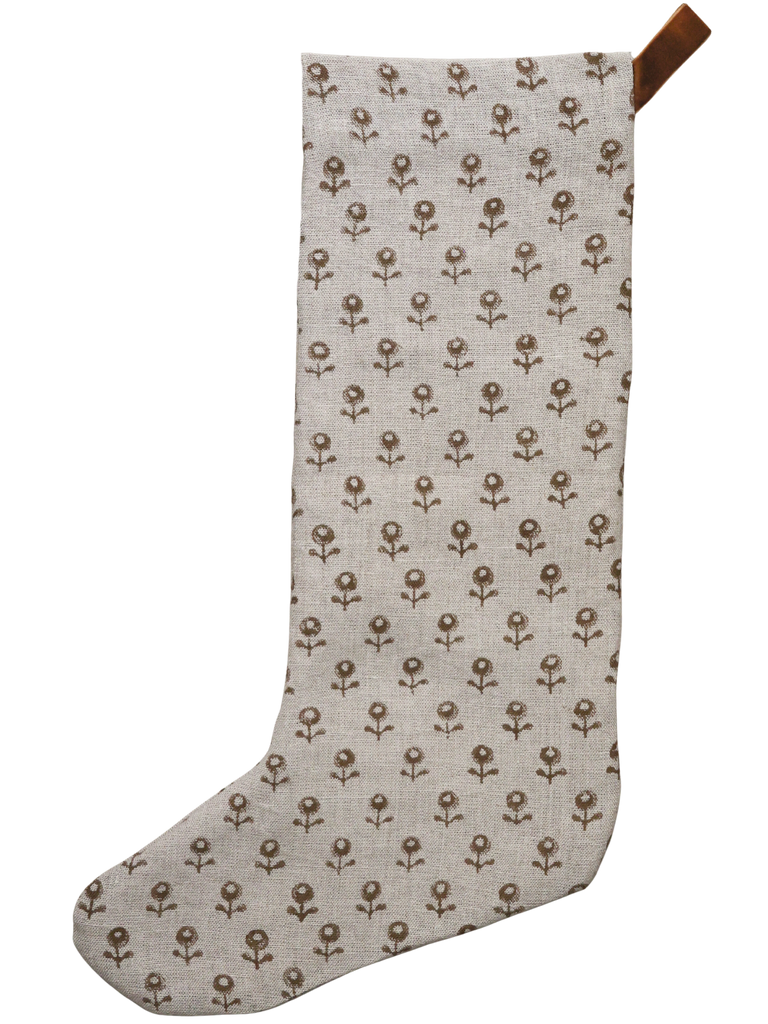 Crafted from pure linen and adorned with an artisan block print motif, each stocking reflects the timeless character of handmade Christmas décor. The addition of a rich velvet loop hook offers both function and sophistication, making it an heirloom-worthy piece to hang along your mantel or staircase.