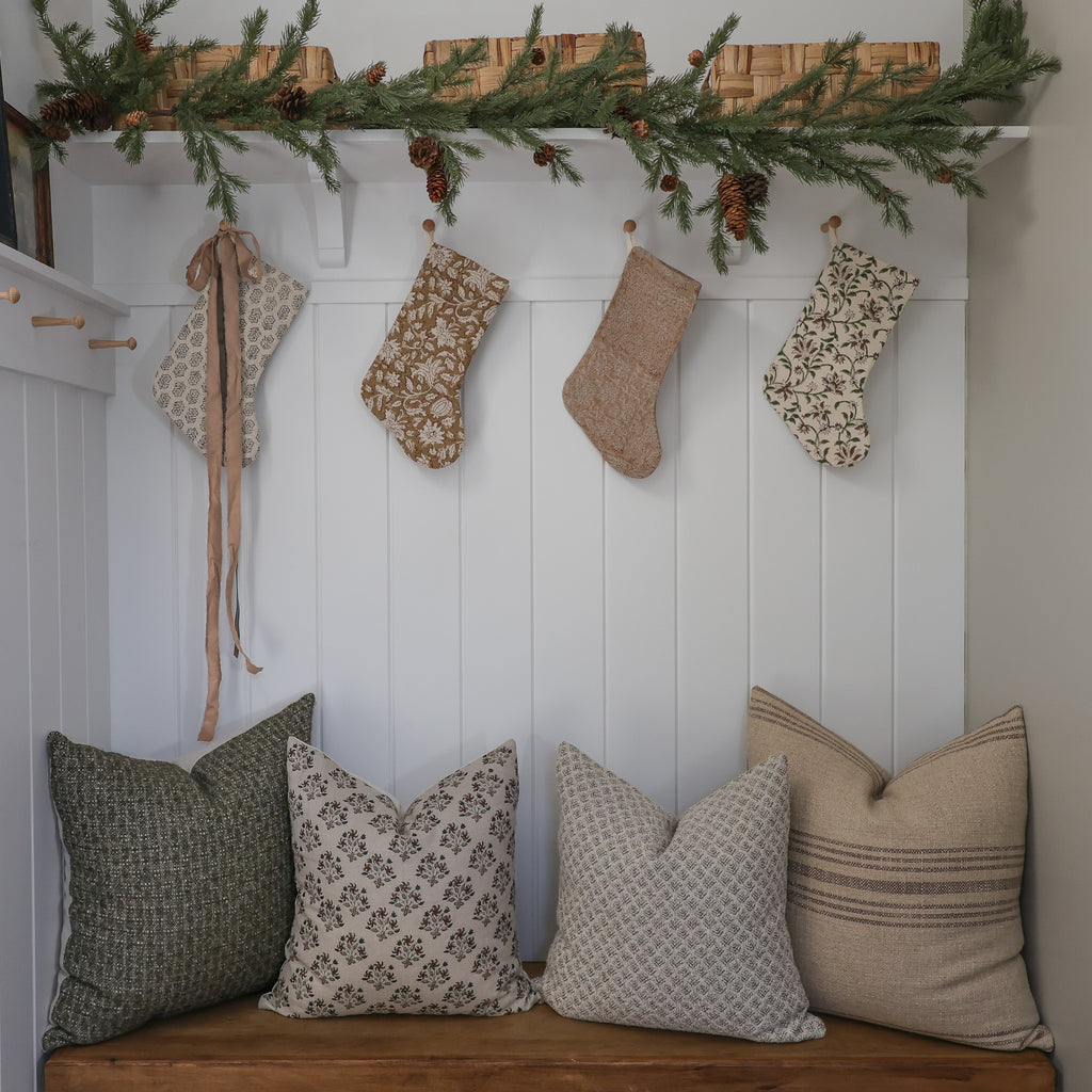 Enjoy our Linen Block Print Christmas Stocking made with 100% linen fabric in hand stamped block print deigned. This handmade fabric offers a curated design that is only achieved by the unique characteristics of wabi decor. An original design by Hackner Home.