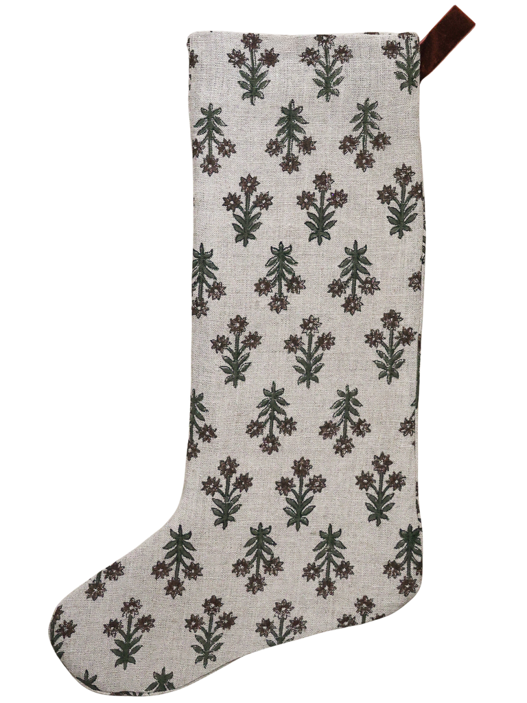 Crafted from pure linen and adorned with an artisan block print motif, each stocking reflects the timeless character of handmade Christmas décor. The addition of a rich velvet loop hook offers both function and sophistication, making it an heirloom-worthy piece to hang along your mantel or staircase.