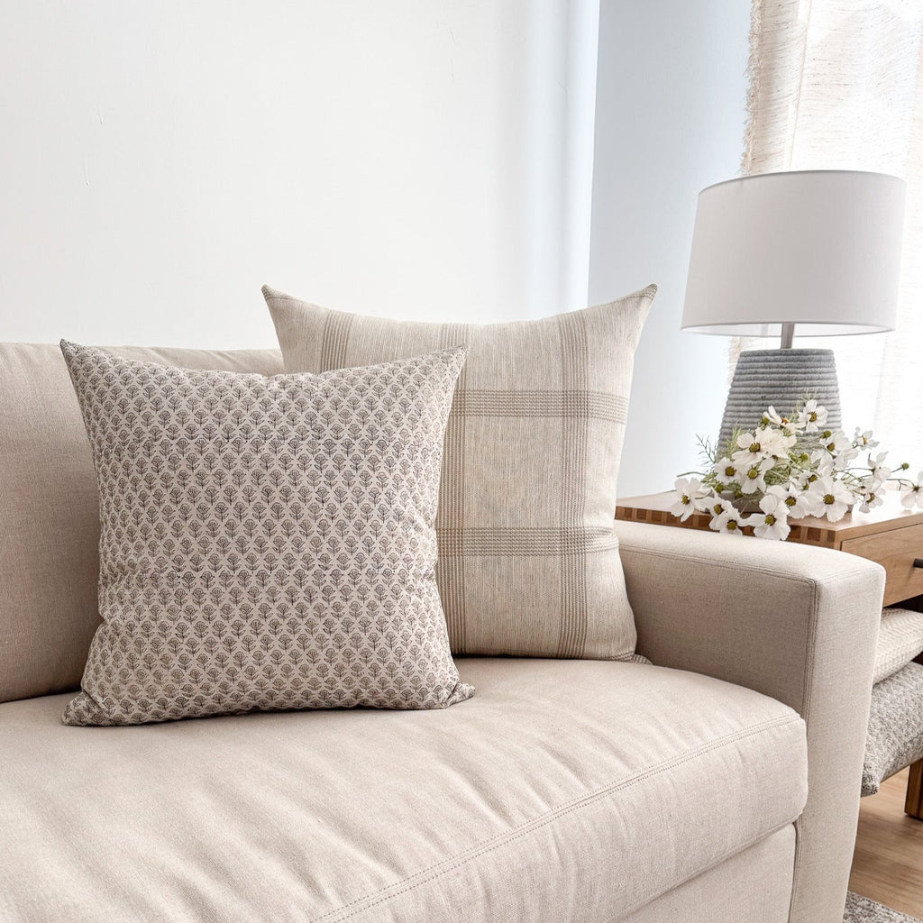 Our White Flowers Pillow Cover offers neutral woven 100% linen fibers and smooth touch. Wabi is the beauty found in perfectly raw state things. It is valued by offering character traits only handmade or well over time love items can offer. This the fabric design was hand crafted with a wooden carved stamp and hand painted with colors made form plants. Sold exclusively at Hackner Home. Mix and match with other pillow covers from the shop.