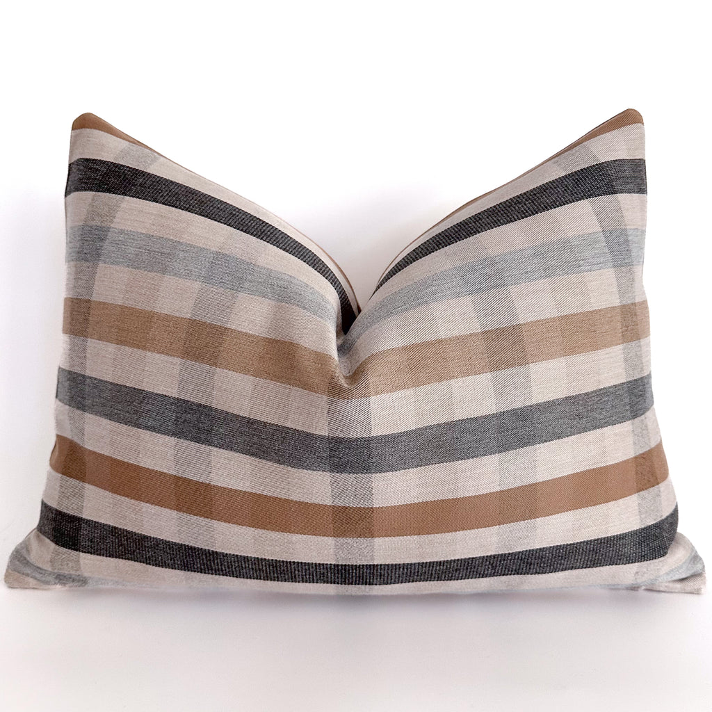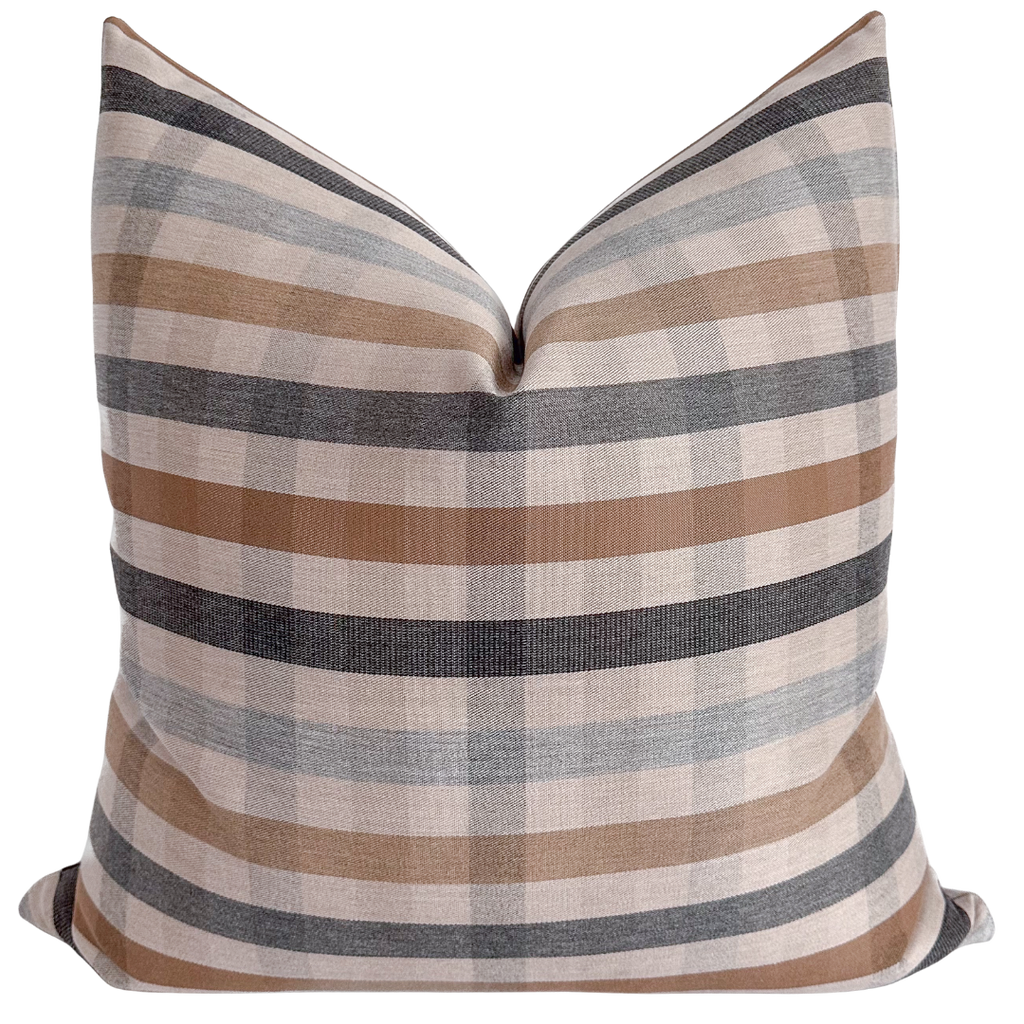 Classic pattern meets modern refinement in the Lad Plaid Pillow Cover. Woven in a tailored plaid of warm camel, soft cream, cool gray, and deep charcoal, this designer piece brings structure and understated sophistication to any space.