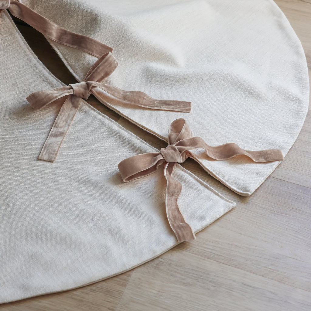 The White Vintage Linen Christmas Tree Skirt offers a smooth and soft warm neutral tone. Handmade from woven designer fabric in natural and neutral fibers. It provides a luxurious setting for the holiday tree and compliments your beautifully wrapped gifts. Made entirely by hand in a classic solid pattern with a lined back for quality and durability. Mix and match our Christmas Stocking with this tress skirt to complete the look. Original design by Hackner Home.