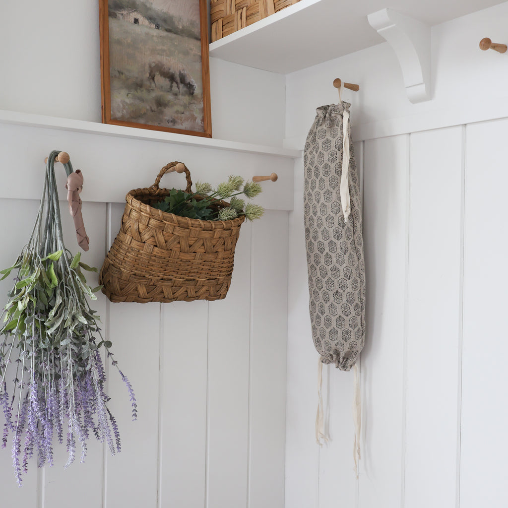 Our Grocery Plastic Bag Holder Dispenser offers a stylish and functional addition to your kitchen! Made from 100% linen with a designer block print fabric, this dispenser combines practicality with elegance. Say goodbye to cluttered cabinets and hello to organized storage for your plastic bags. Whether you recycle plastic bags to reuse for grocery shopping or lining trash cans, our dispenser keeps them neatly contained and easily accessible. Its versatile design and chic fabric make it a standout piece in any kitchen. Simplify your space and elevate your home decor with this charming accessory today! Makes a great gift.