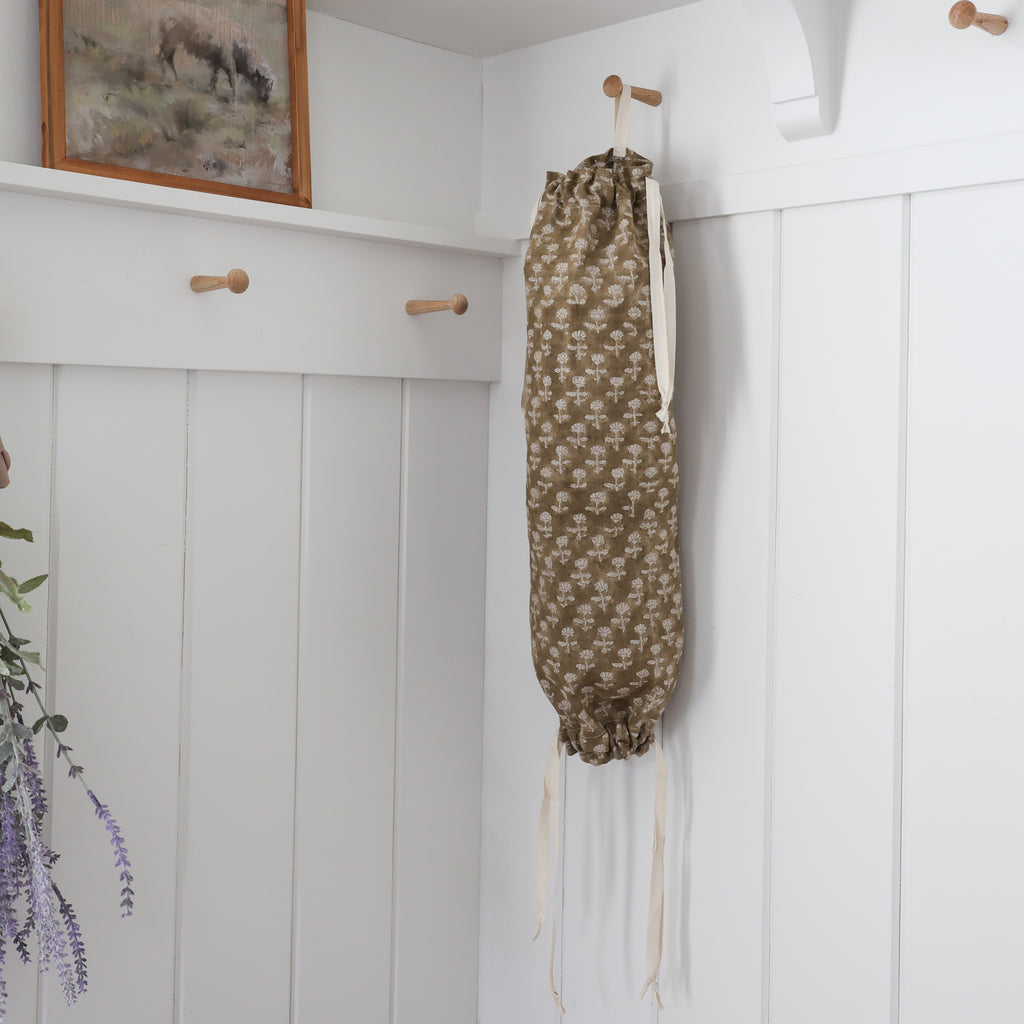 Cloth Grocery Bag Holder 'Heirloom Floral Brown Linen Block Print'