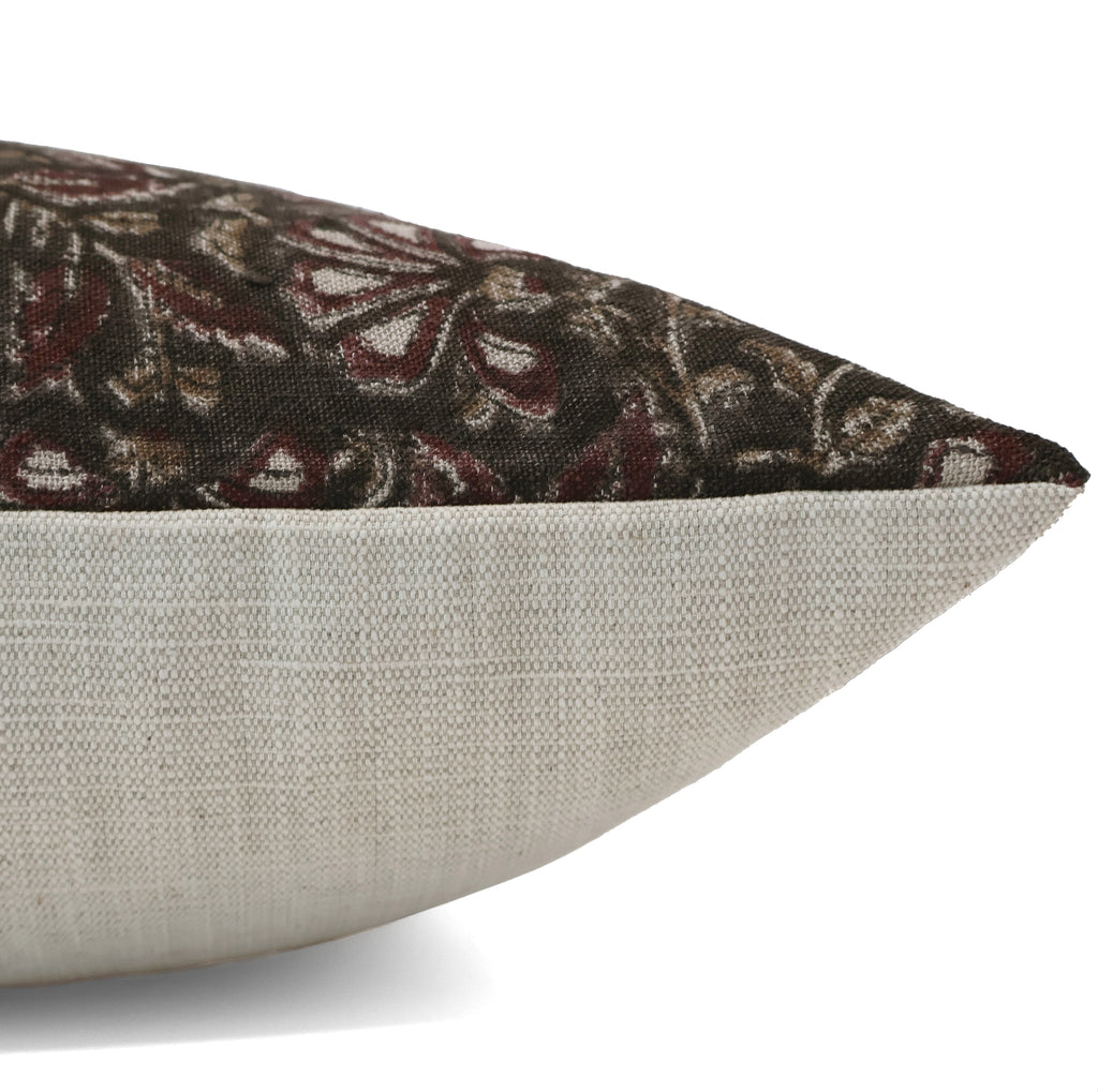 Handcrafted lumbar pillow cover with dark floral block print in maroon, beige, and white tones — bohemian decorative cushion by Hackner Home.