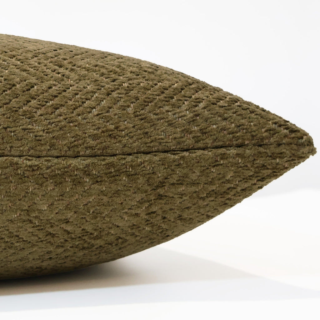 Side view of sequoia green velvet pillow cover featuring soft herringbone texture — elegant handcrafted cushion by Hackner Home.