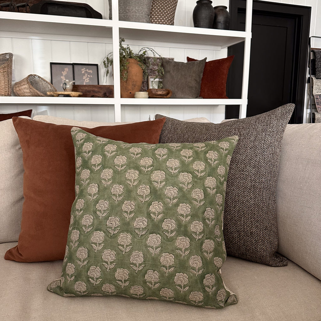 Our Antique Green Floral Block Print Pillow Cover is made of 100% linen and is from our Block Print Collection of authentic vegetable dyed fabric & hand pressed to create their unique design. The perfect green color offers a transitional style that will pair beautifully with many pillows from the shop. This pillow cover is made out of hand dyed woven linen fabric and is perfectly imperfect in its design.