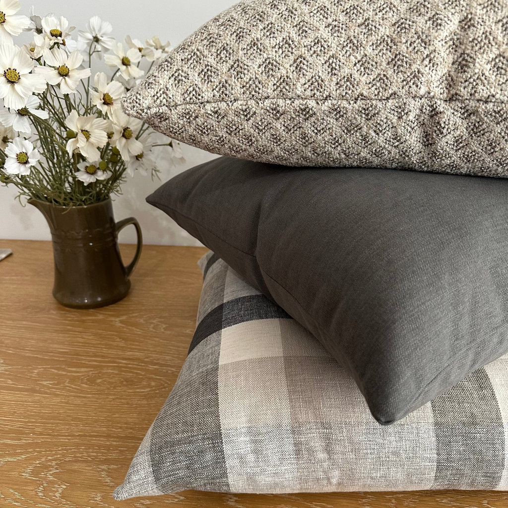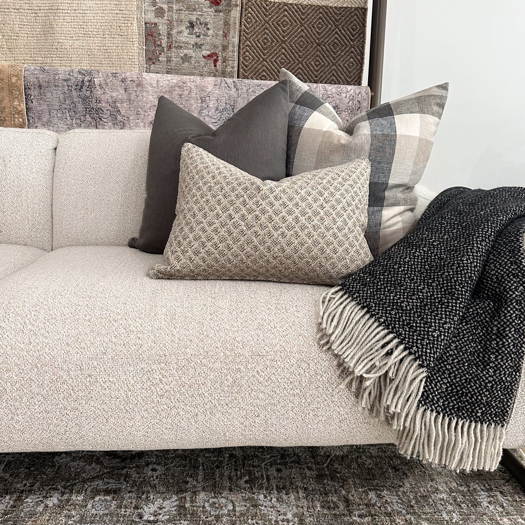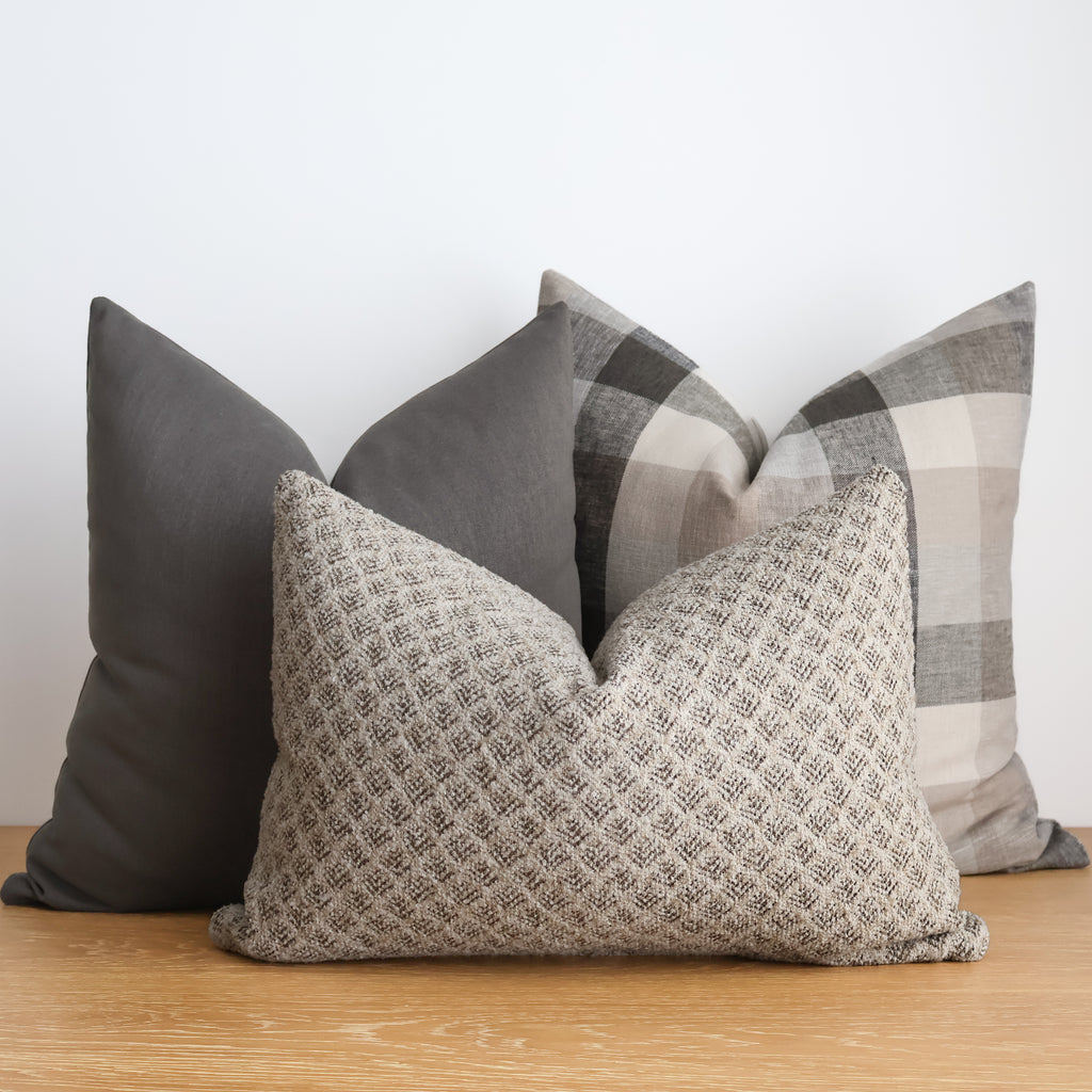 Bring timeless sophistication and layered texture into your home with the Timberland Pillow Cover Set by HACKNER HOME. This curated set of three handmade designer pillow covers blends modern organic style with classic heritage patterns, featuring a neutral and gray palette that complements both contemporary and traditional interiors.