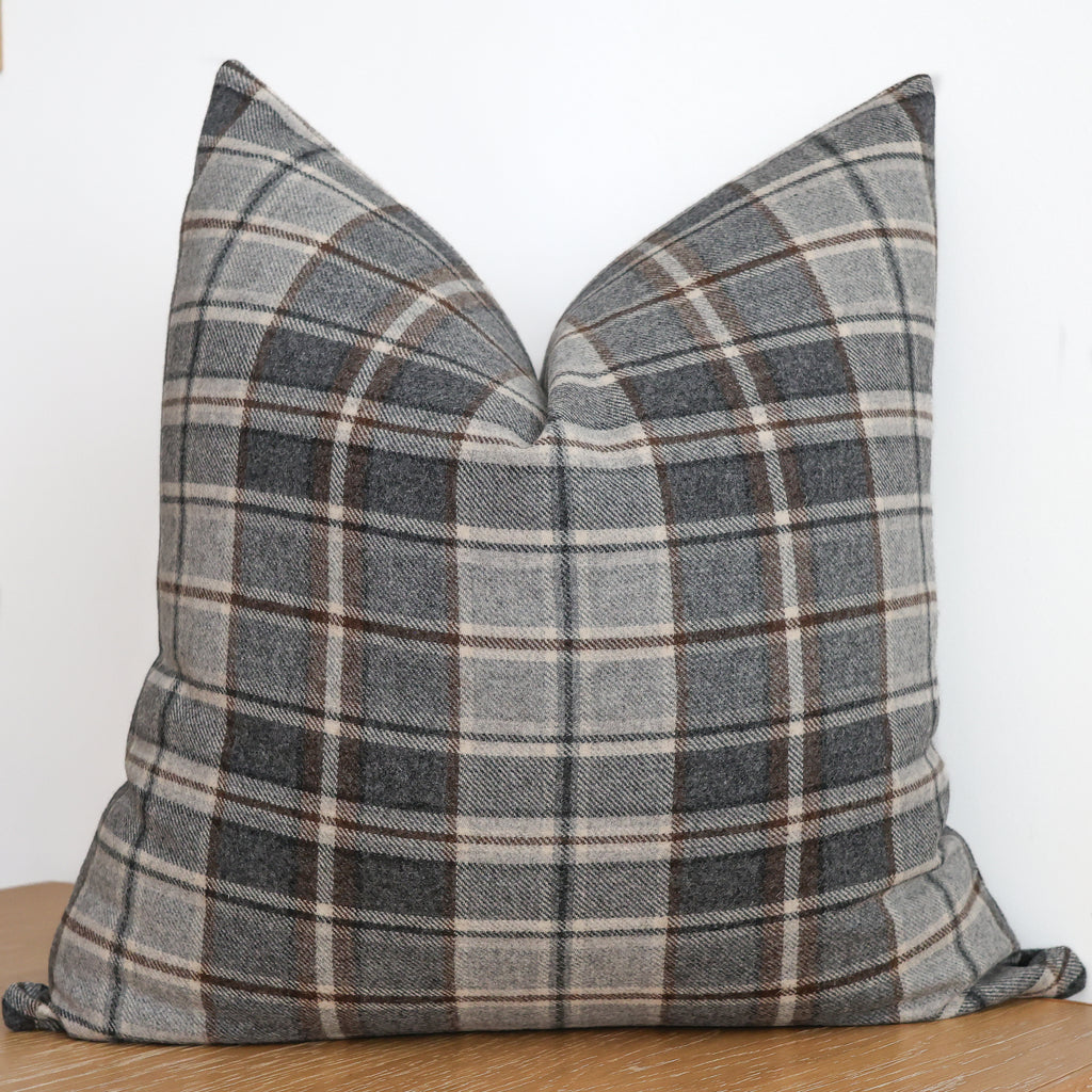 Bring timeless style and cozy sophistication into your home with our handmade designer pillow cover, crafted from a soft wool blend fabric in a classic gray and brown plaid. Each pillow is carefully made by hand in the HACKNER HOME studio, combining elevated craftsmanship with a design that feels both refined and inviting.