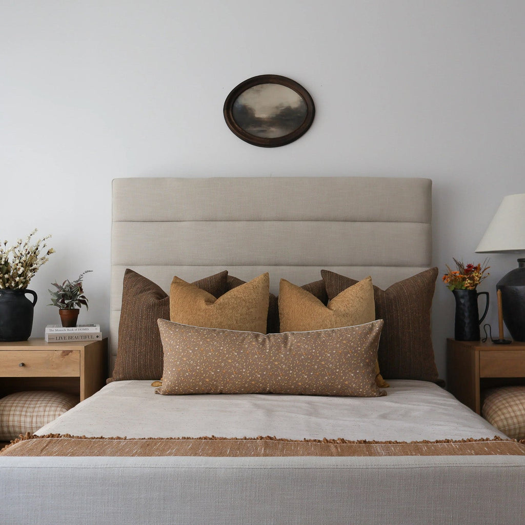 Bedroom styled with Hackner Home Patina Café velvet pillow covers in warm brown tones, layered on a neutral upholstered bed with beige and gold accent pillows for a cozy modern look.